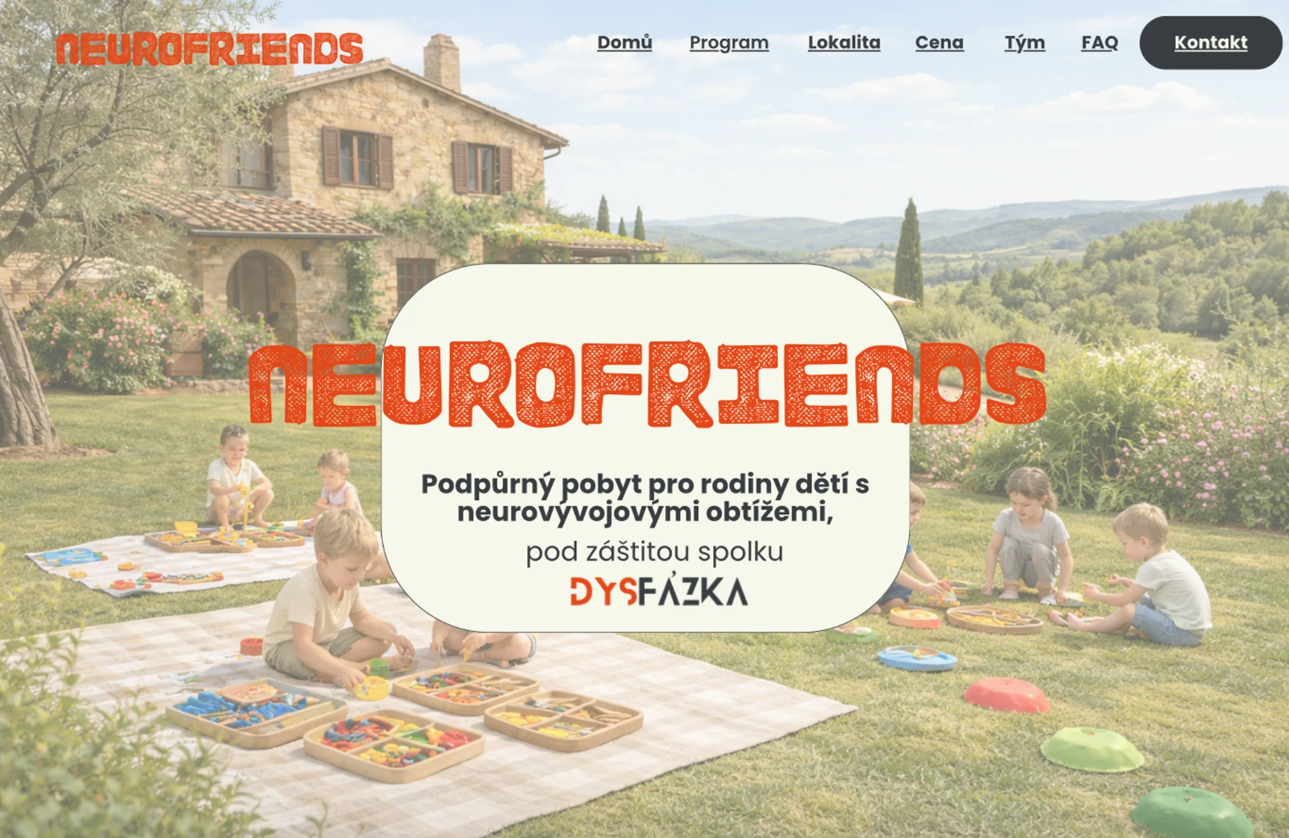 Vývojová dysfázie je závažná neurovývojová porucha řeči a jazyka, která zásadně ovlivňuje každodenní život celé rodiny. Rodiče těchto dětí čelí dlouhodobému psychickému i fyzickému vyčerpání – neustále hledají terapeuty, absolvují logopedická cvičení, řeší přístup škol a školek a zvládají emoční krize svých dětí. Přitom sami zřídkakdy dostávají podporu, kterou potřebují. Projekt Neurofriends reaguje právě na tuto mezeru. Během týdne v Itálii, v srpnu, nabídneme rodinám plnohodnotný program jak pro děti, tak pro rodiče. Program pro děti probíhá pod odborným vedením speciálního pedagoga, neurovývojového terapeuta a asistenta pedagoga.